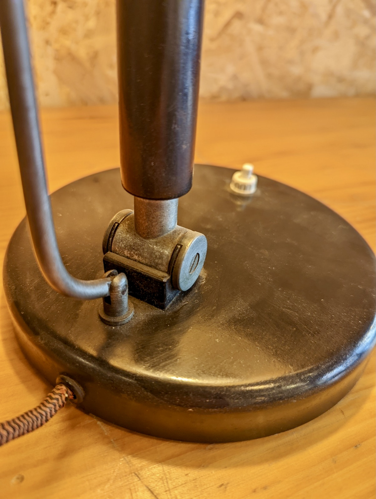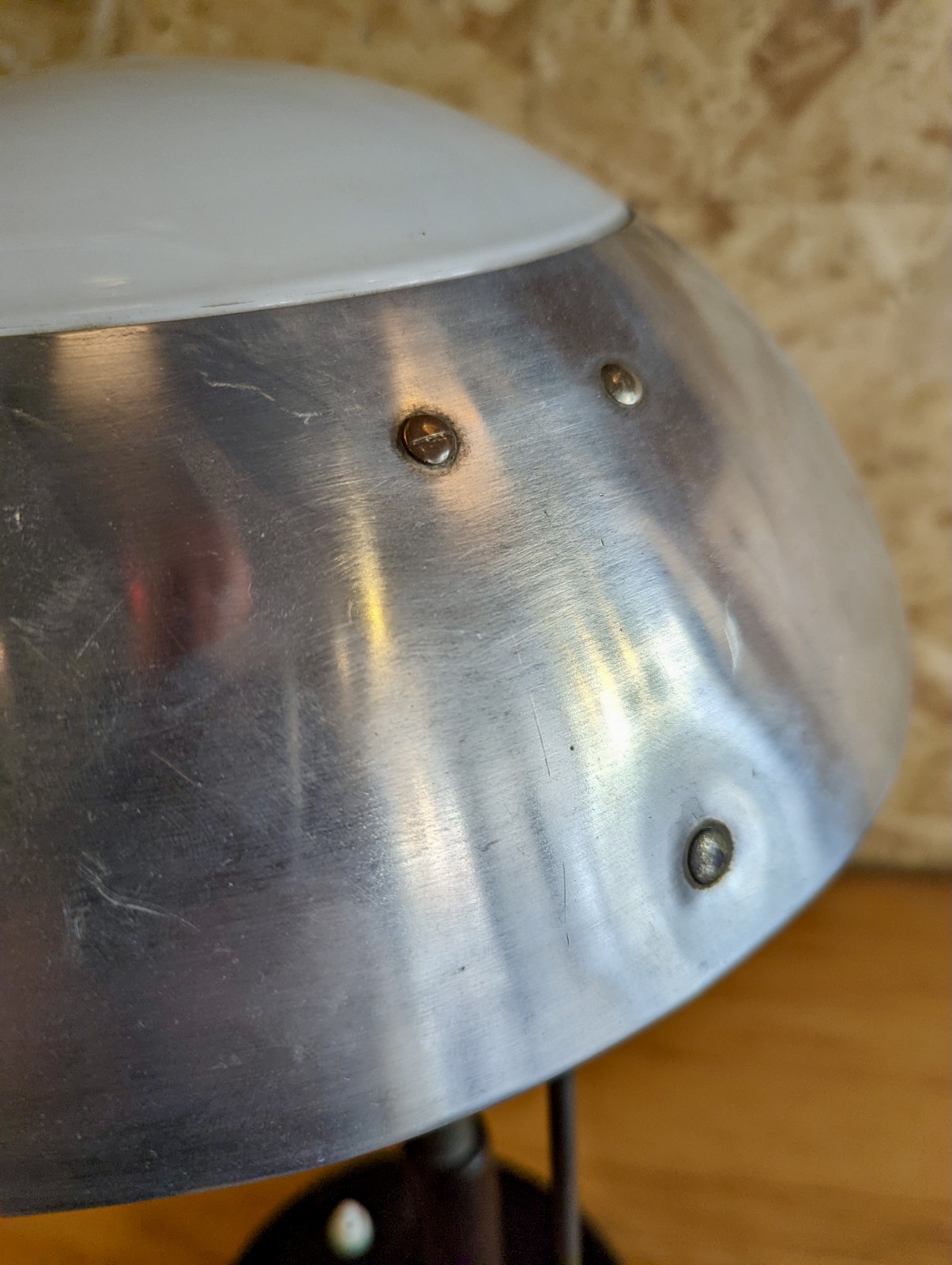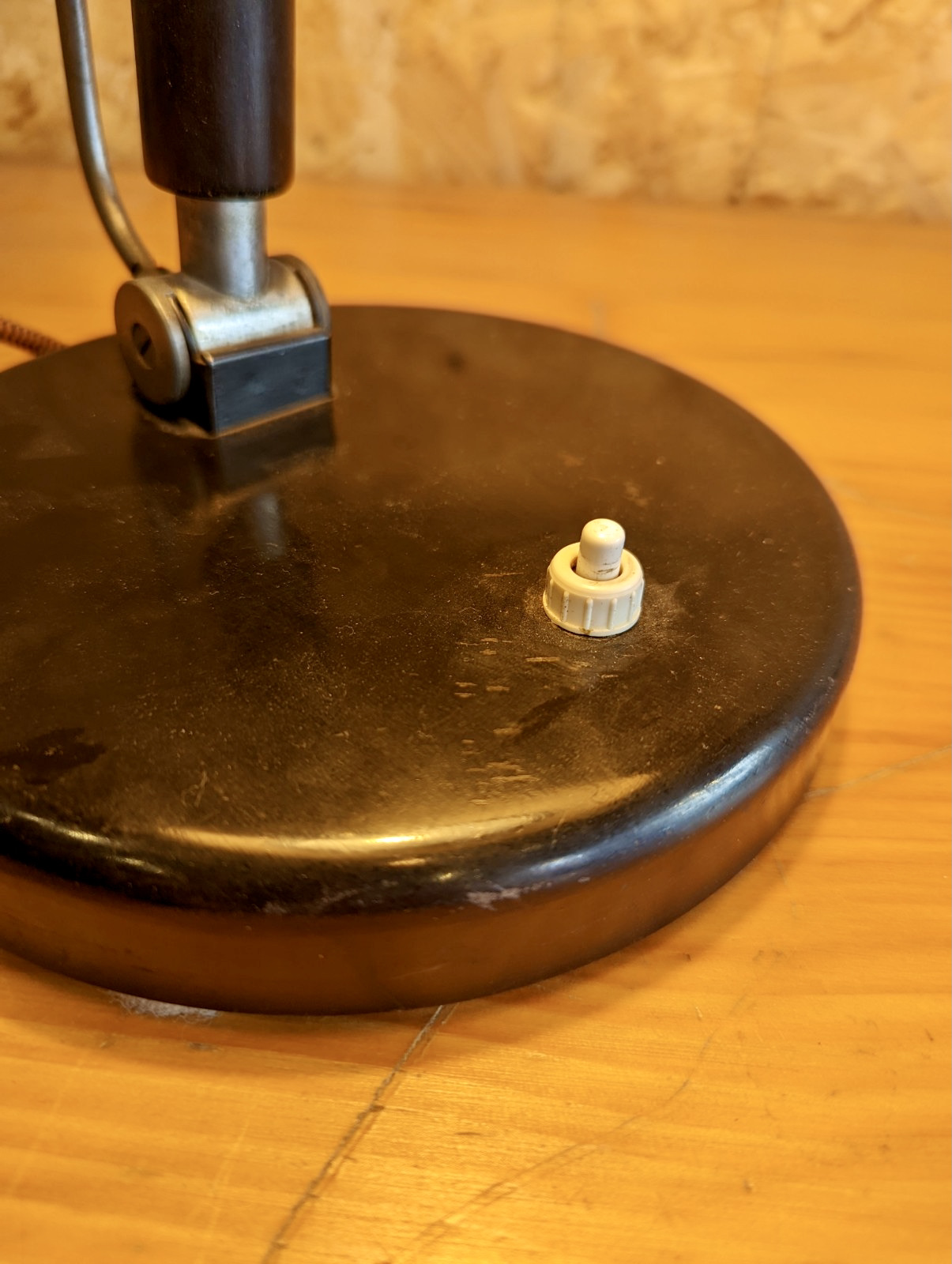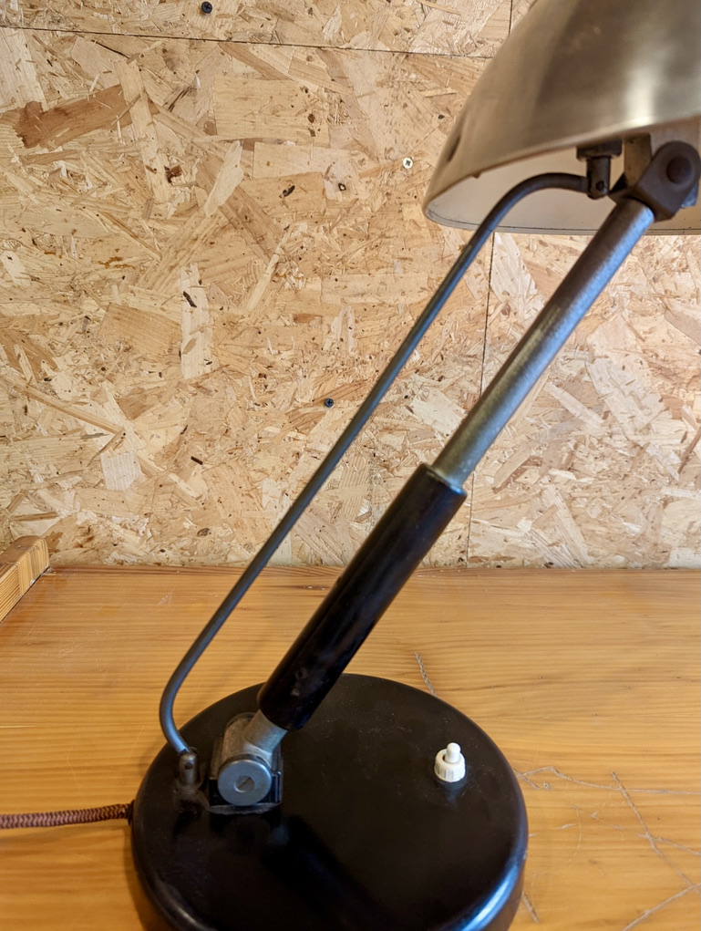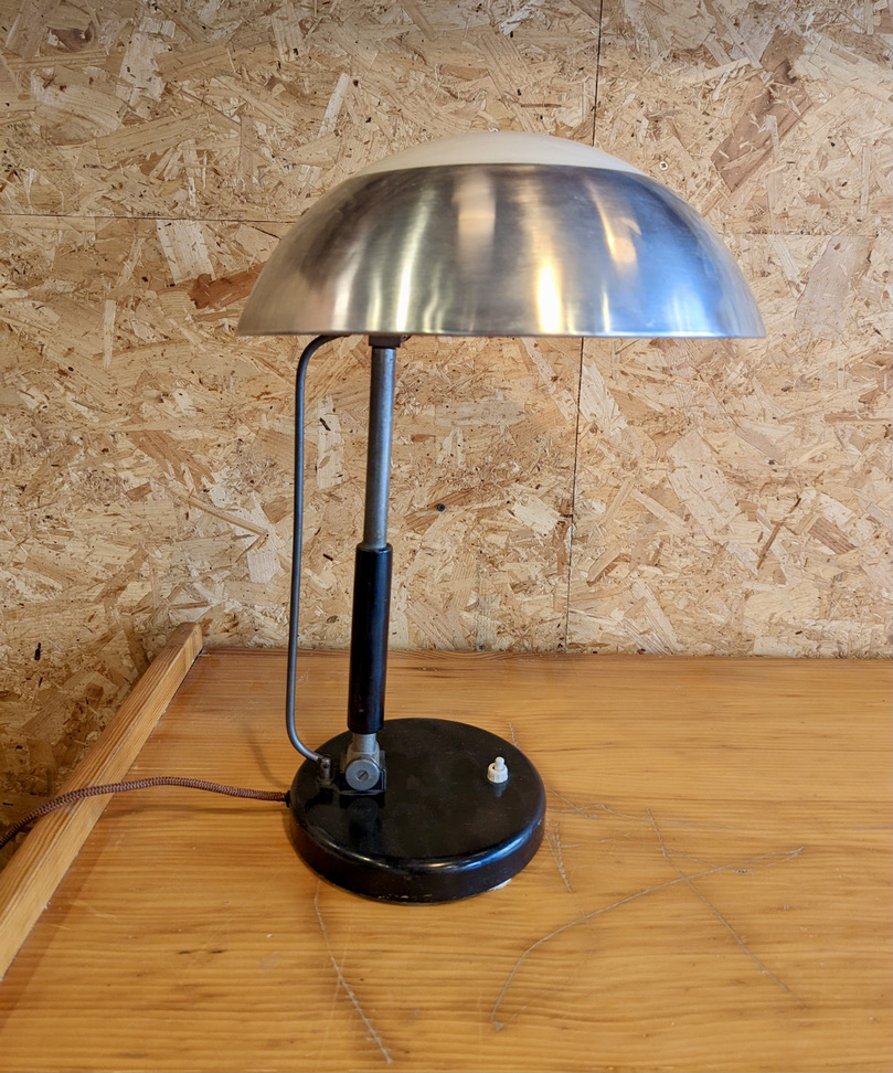 Karl Trabert lamp produced by Schanzenbach und Co. GmbH, (Schaco). Lacquered metal base, polished aluminium & cased glass shade, wood lacquered handle.
