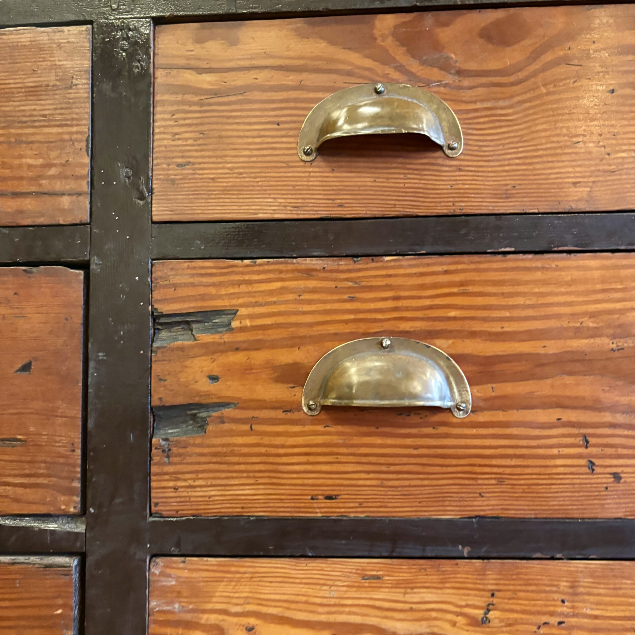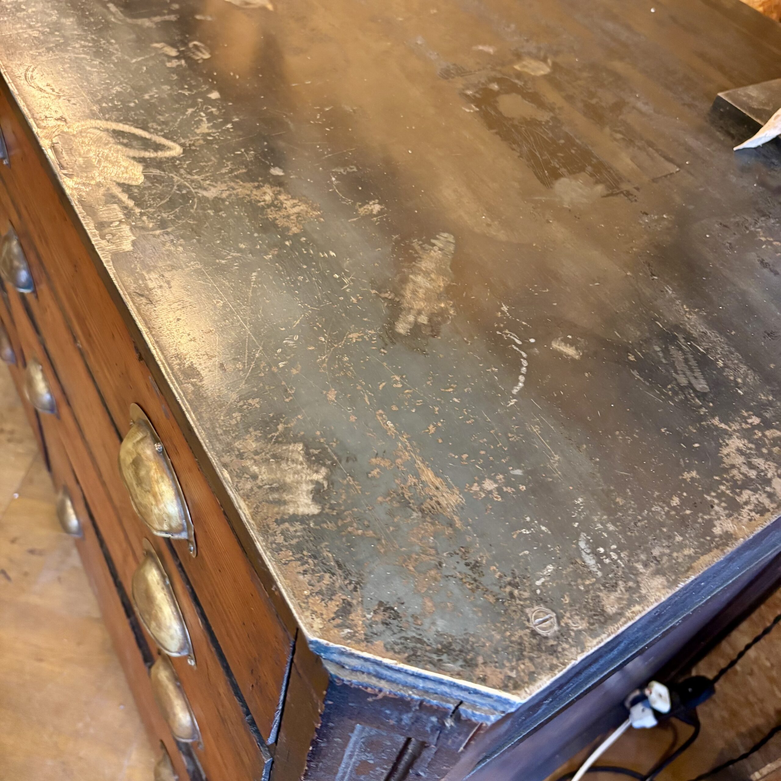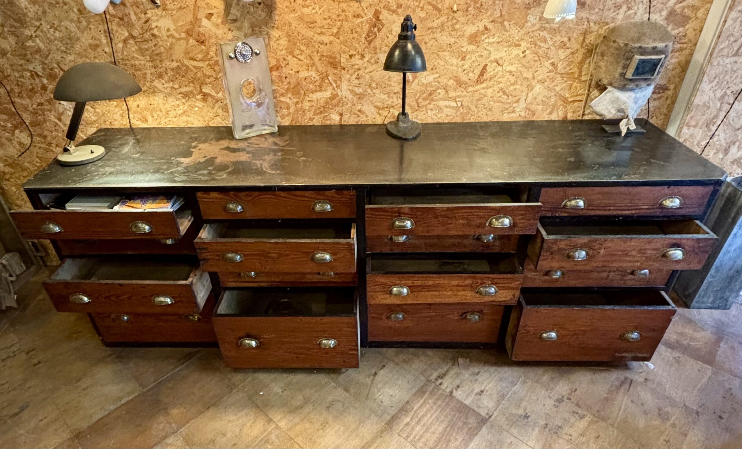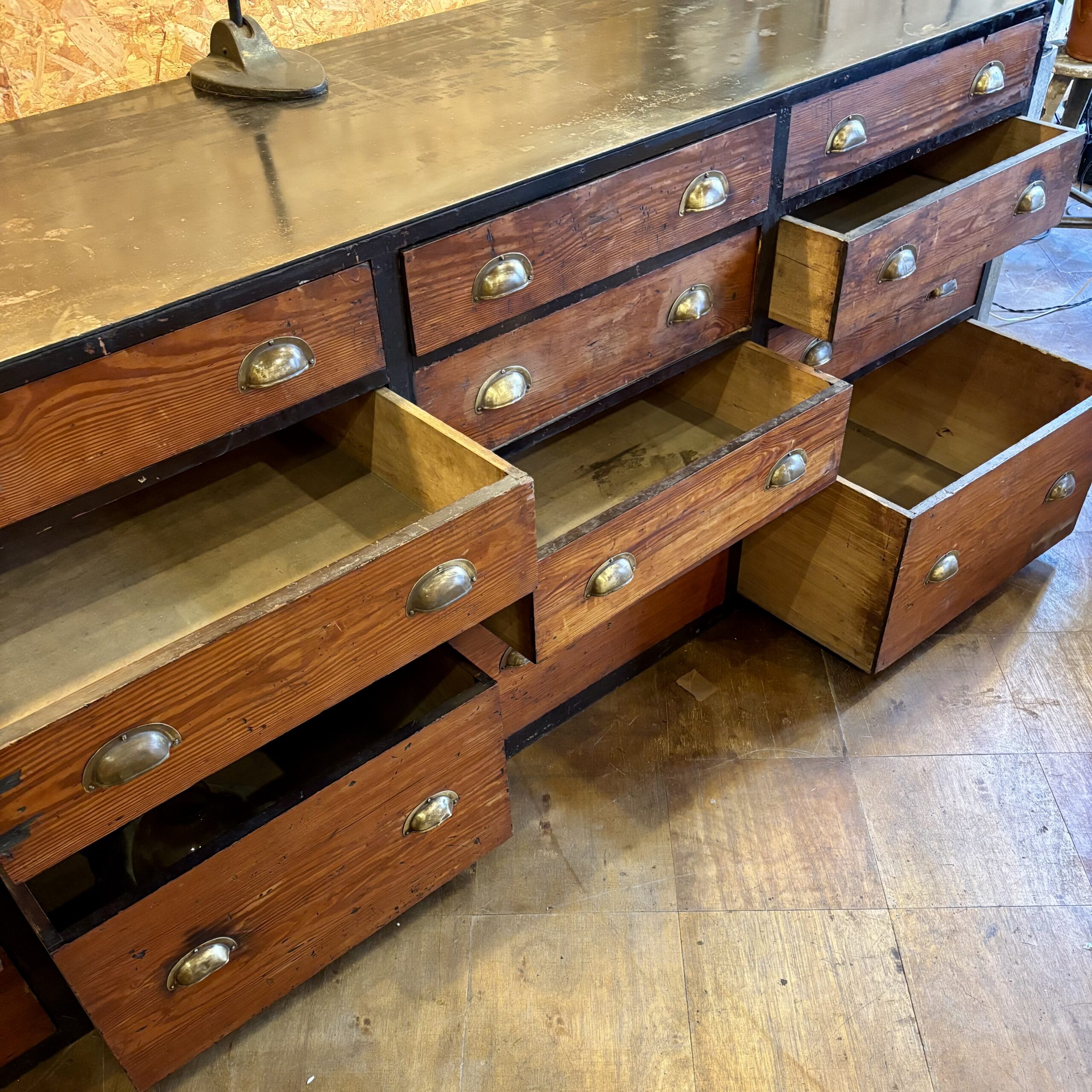 A large industrial work cabinet featuring 16 drawers and a patinated metal top.