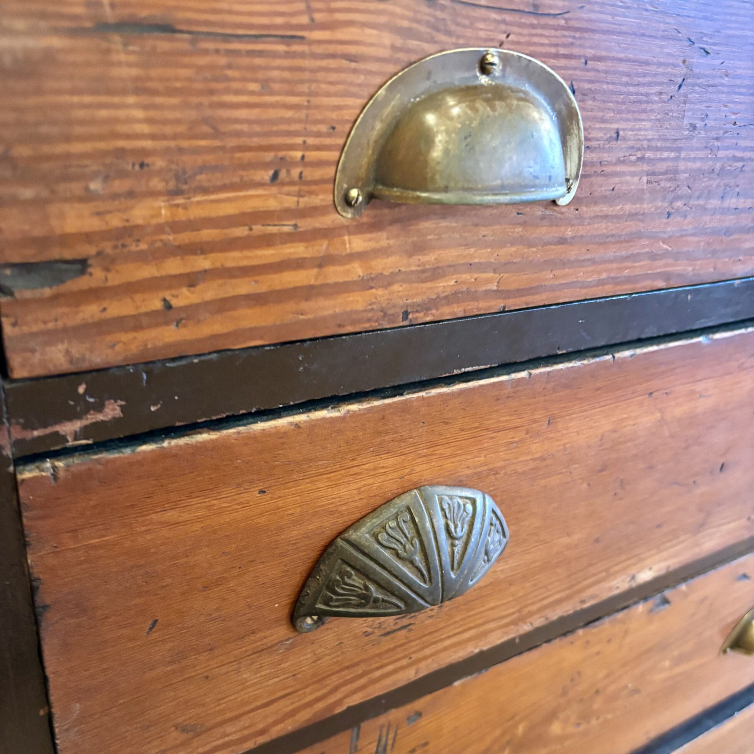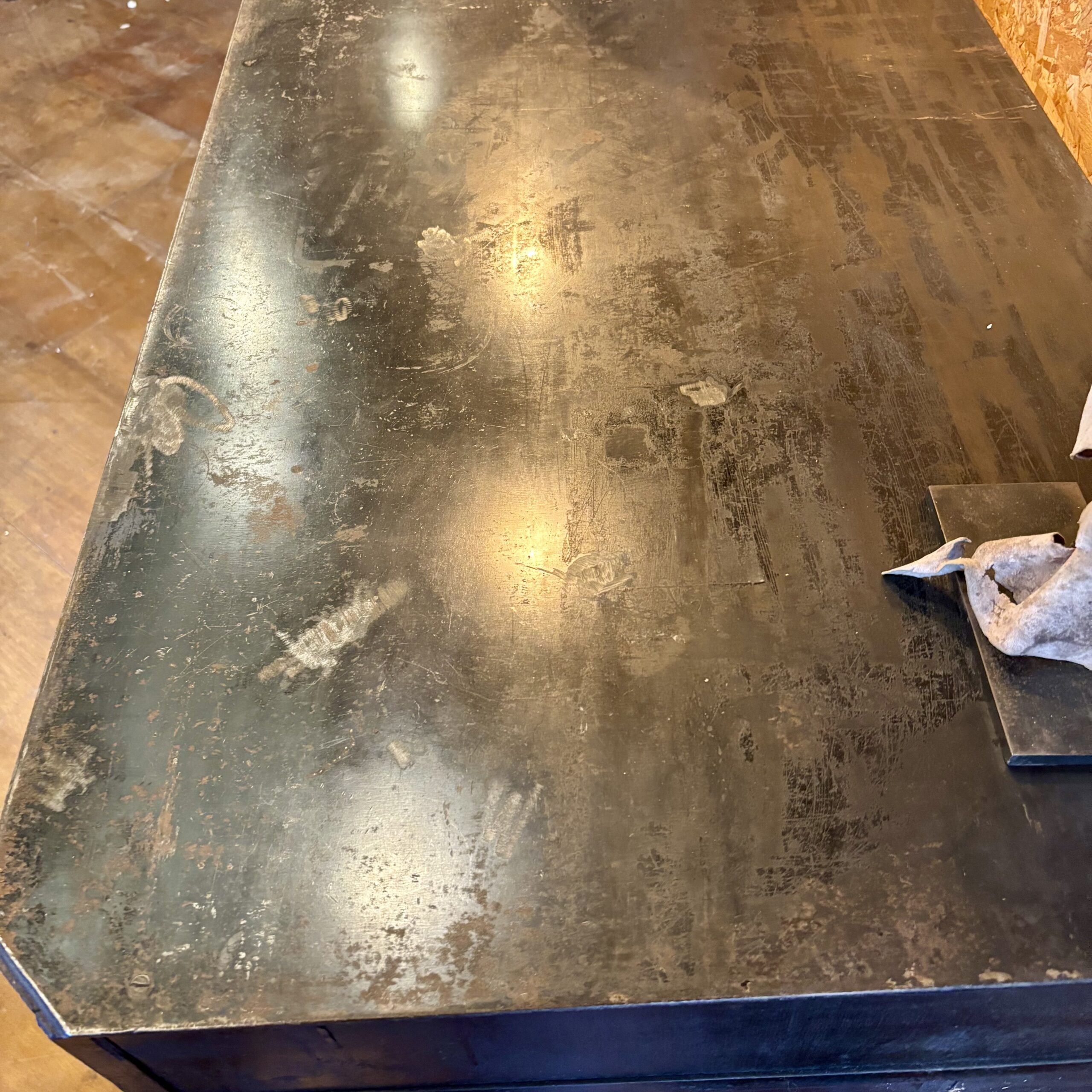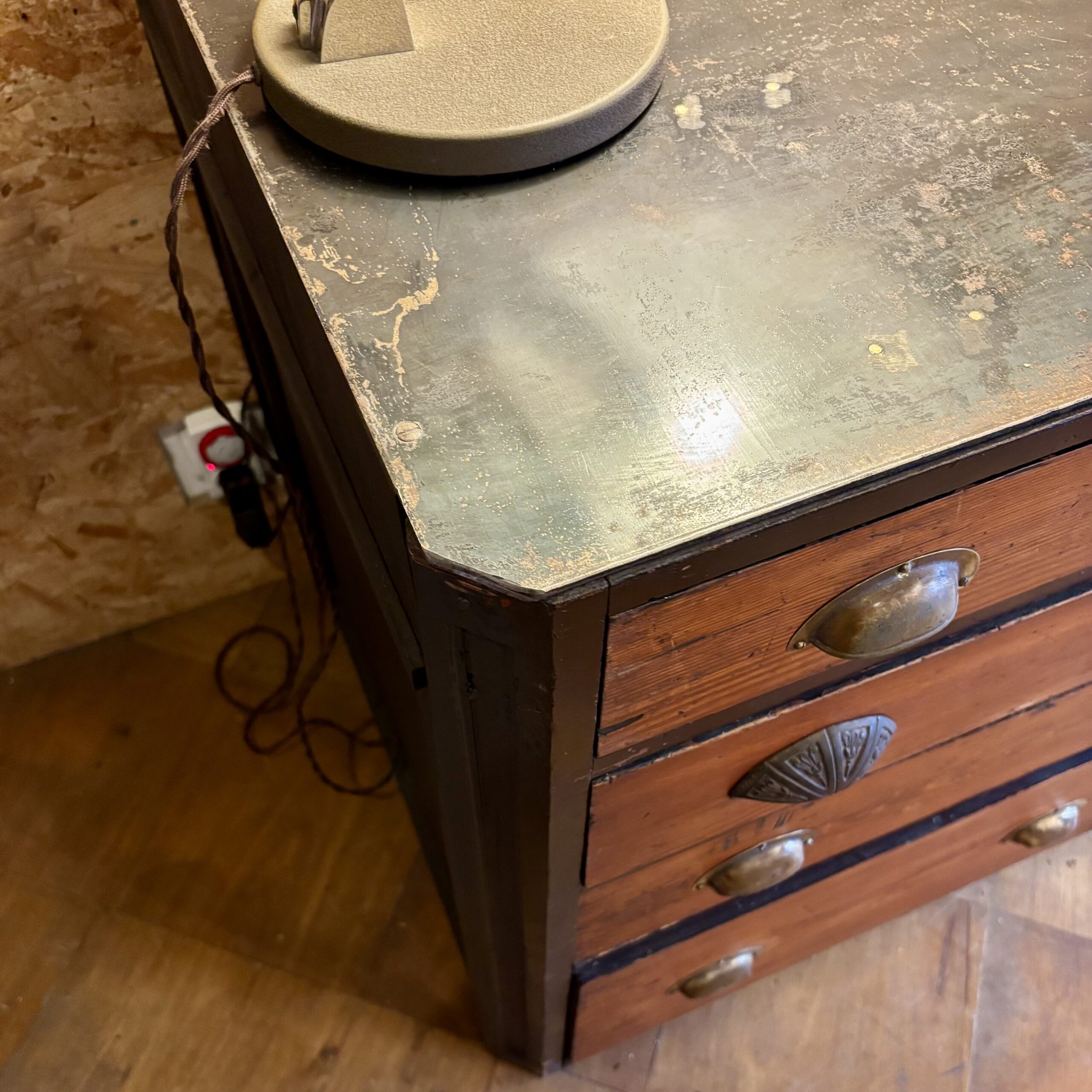 Each drawer offers functional storage, while the metal top provides a durable working surface with a rich, lived-in patina. The straightforward construction and utilitarian proportions make this cabinet equally at home in a workshop, creative studio, or as a distinctive storage piece in a domestic interior.
