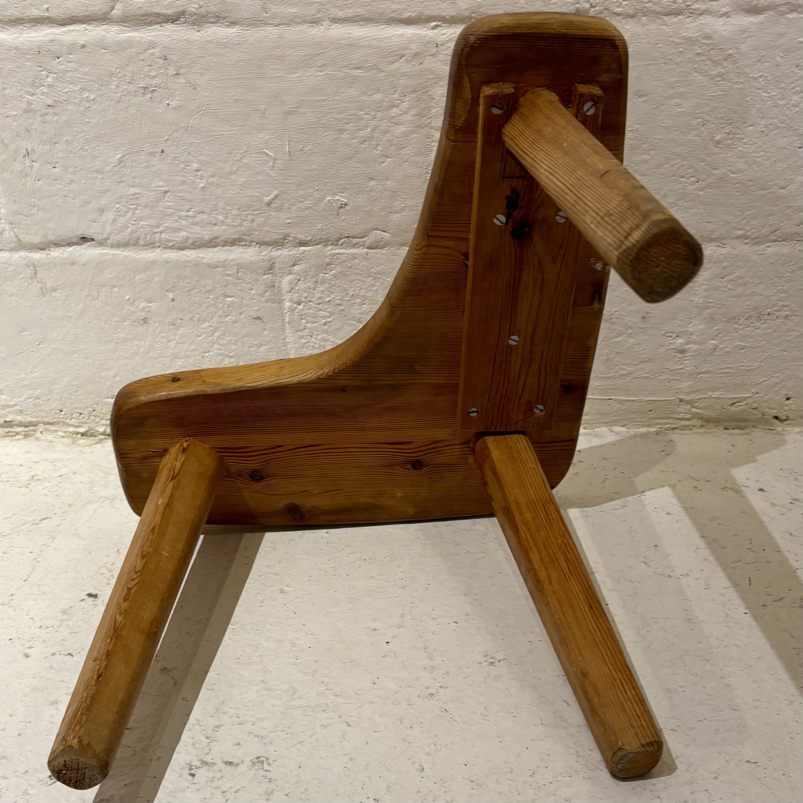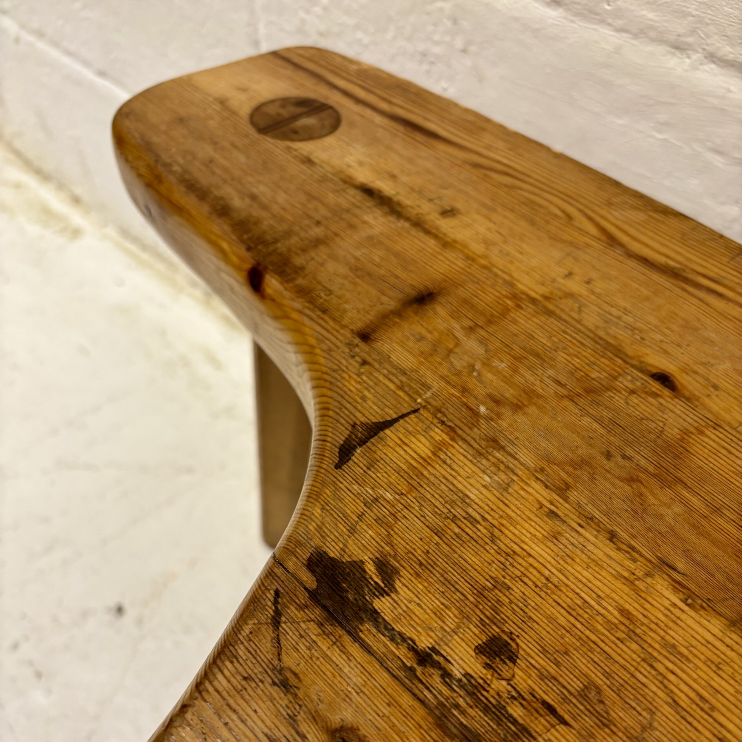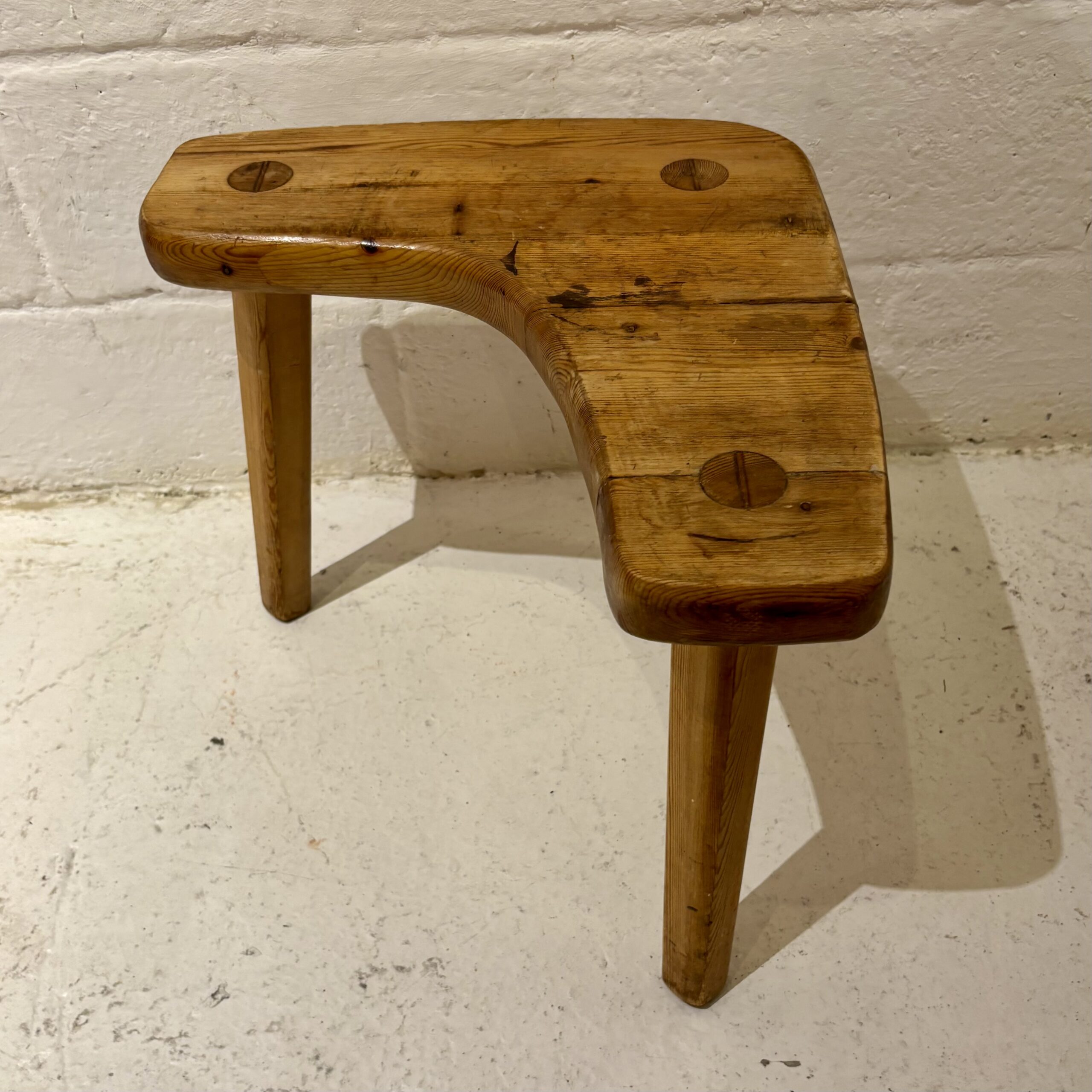 Made in solid pine, with a simple organic shape typical of Scandinavian studio furniture. The construction is straightforward and highlights the natural grain of the wood.