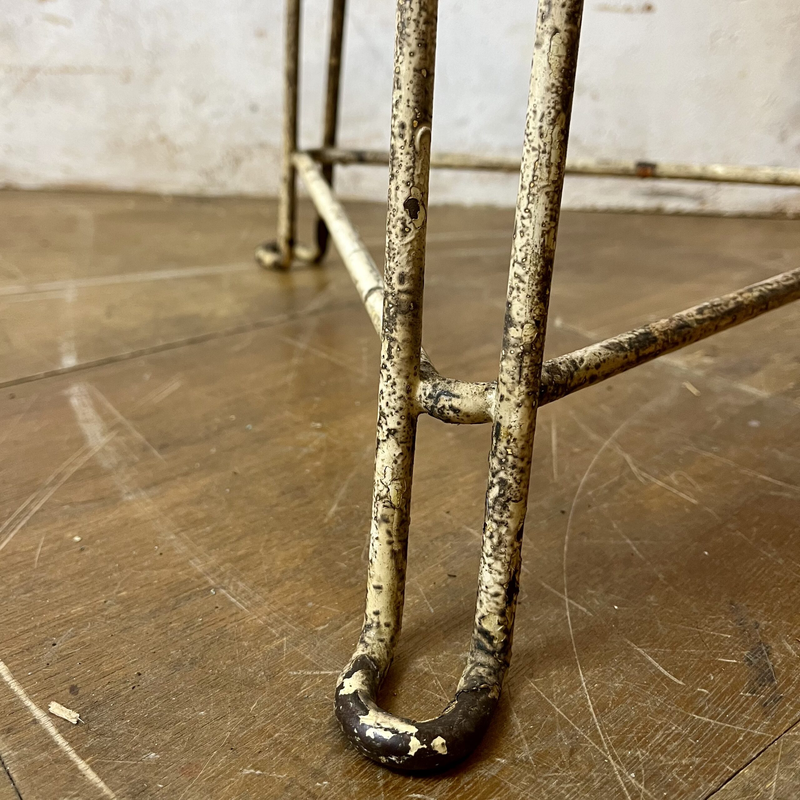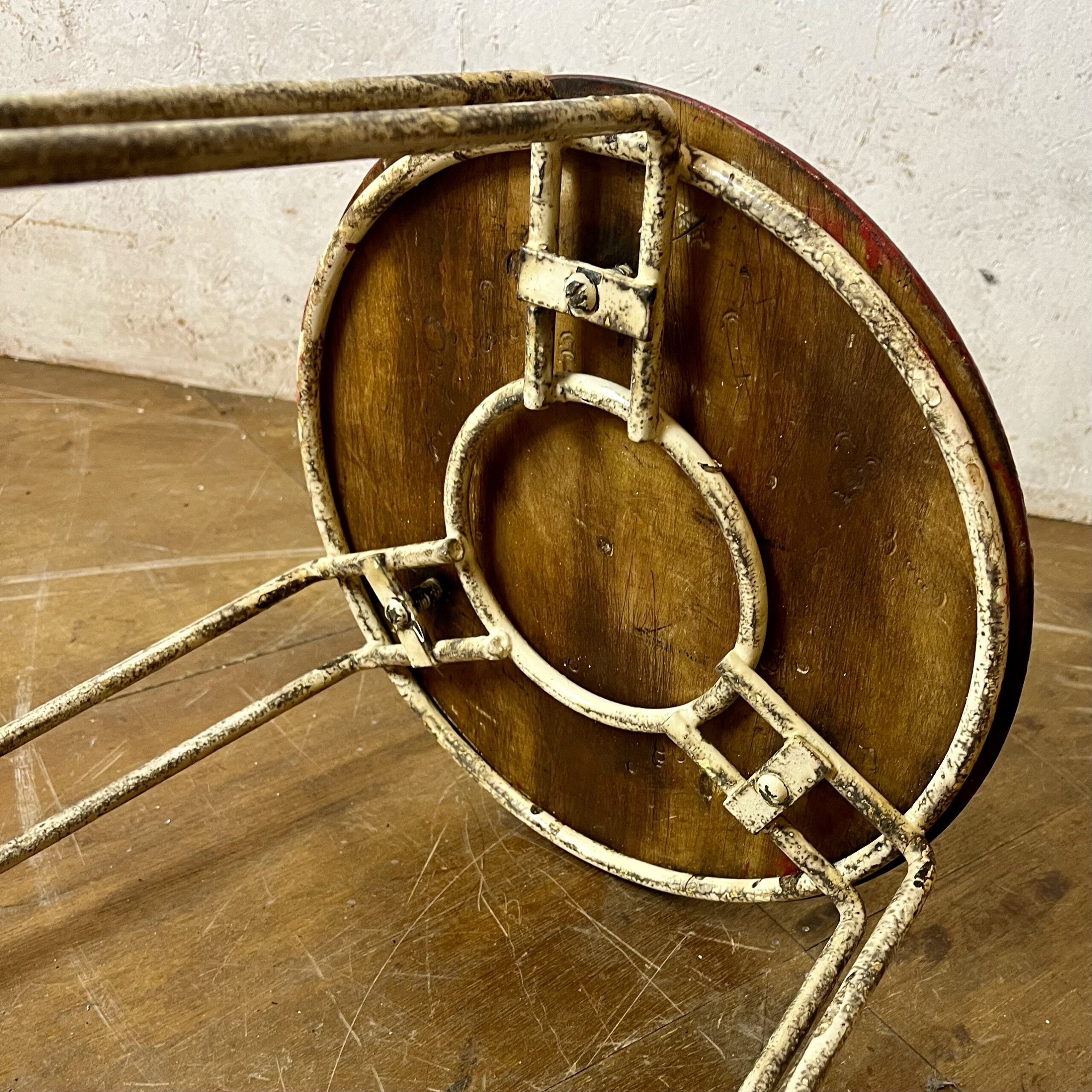 This robust piece combines a solid wooden seat with a metal frame that reflects the practical, utilitarian spirit of its era.